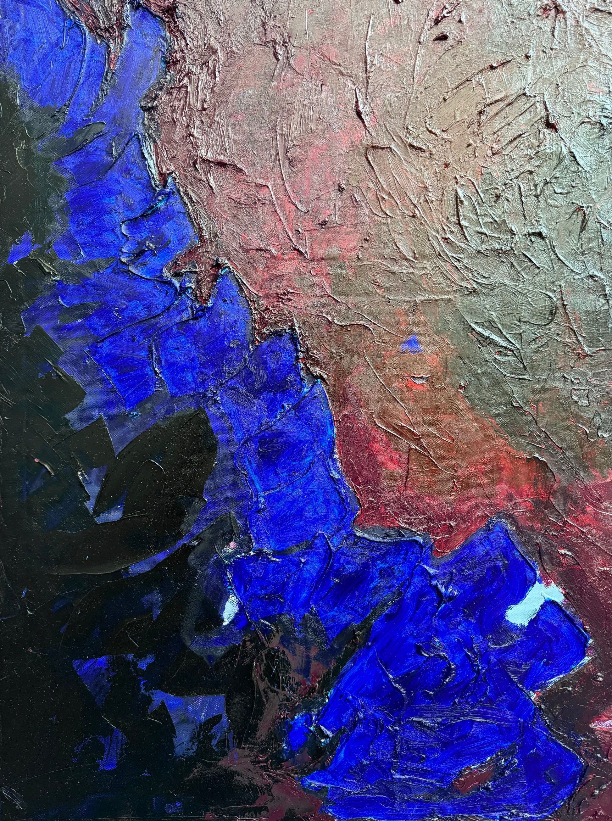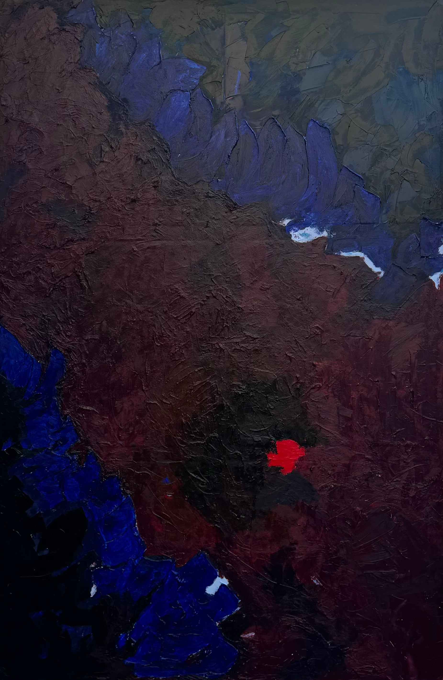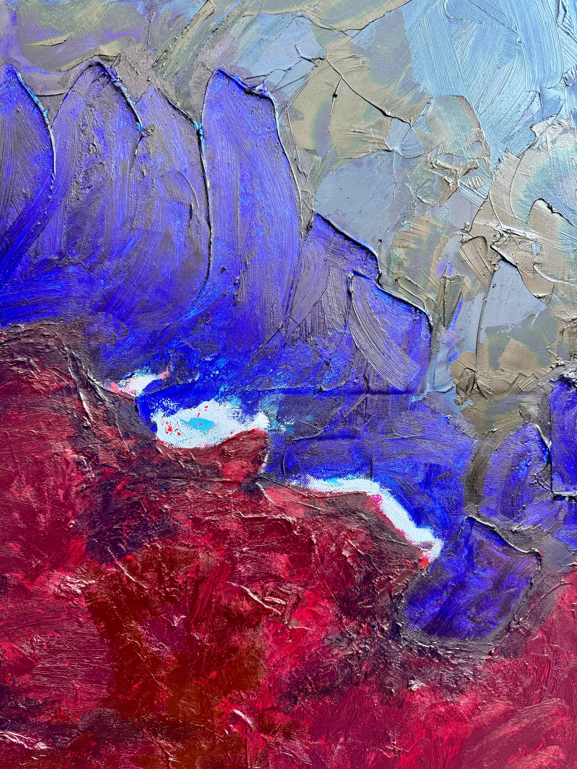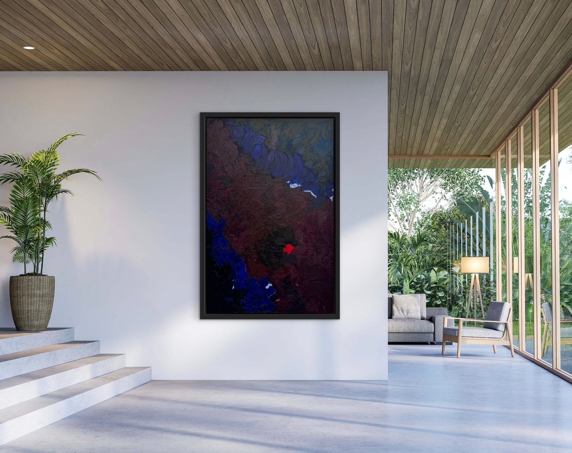“After Dark” evokes a sense of quiet intensity through layered fields of deep burgundy, indigo, and black. A single burst of crimson emerges from the depths, a point of tension and vitality within the stillness. The textured surface captures movement and emotion, inviting contemplation of what lingers beyond the visible.