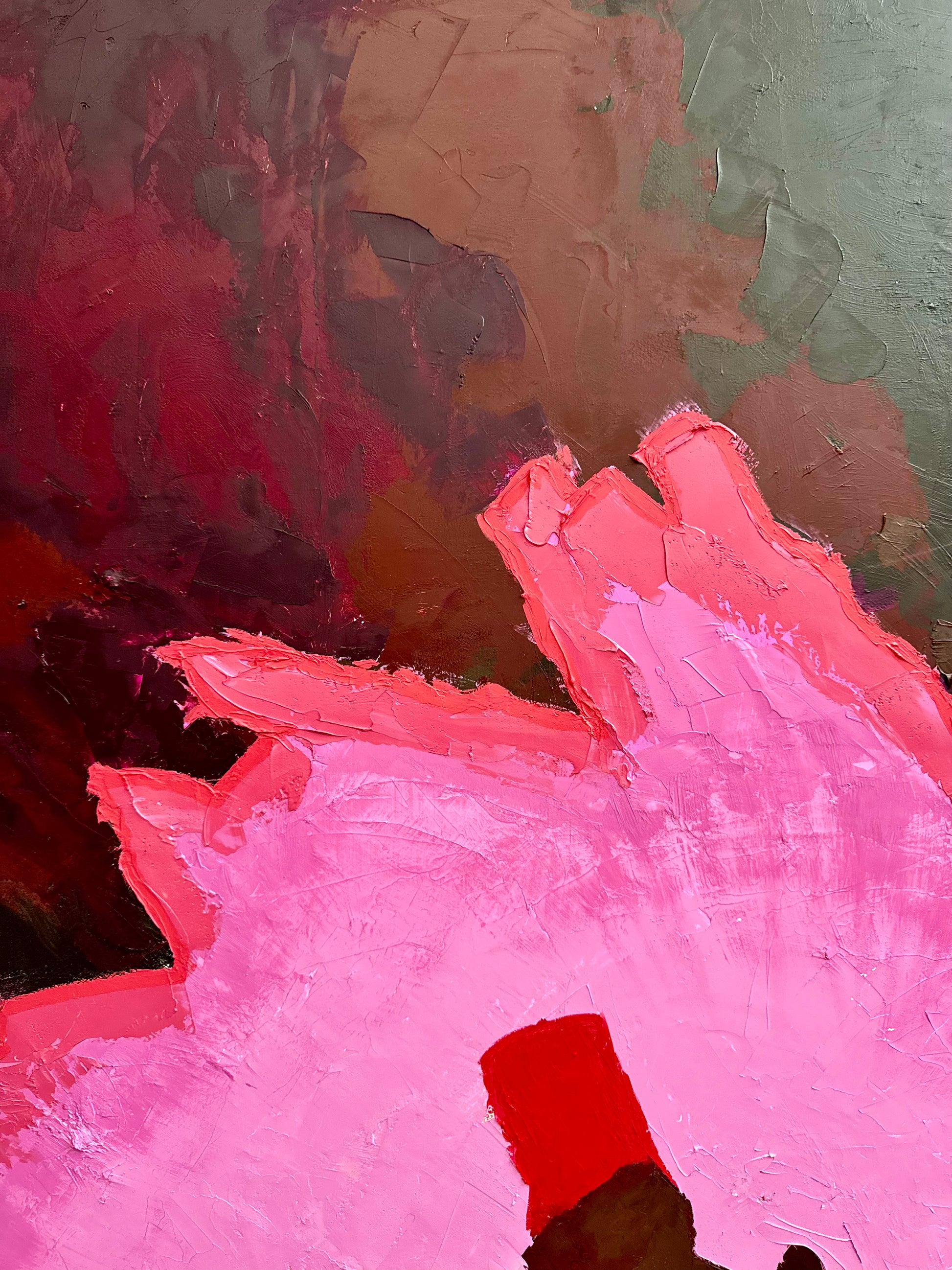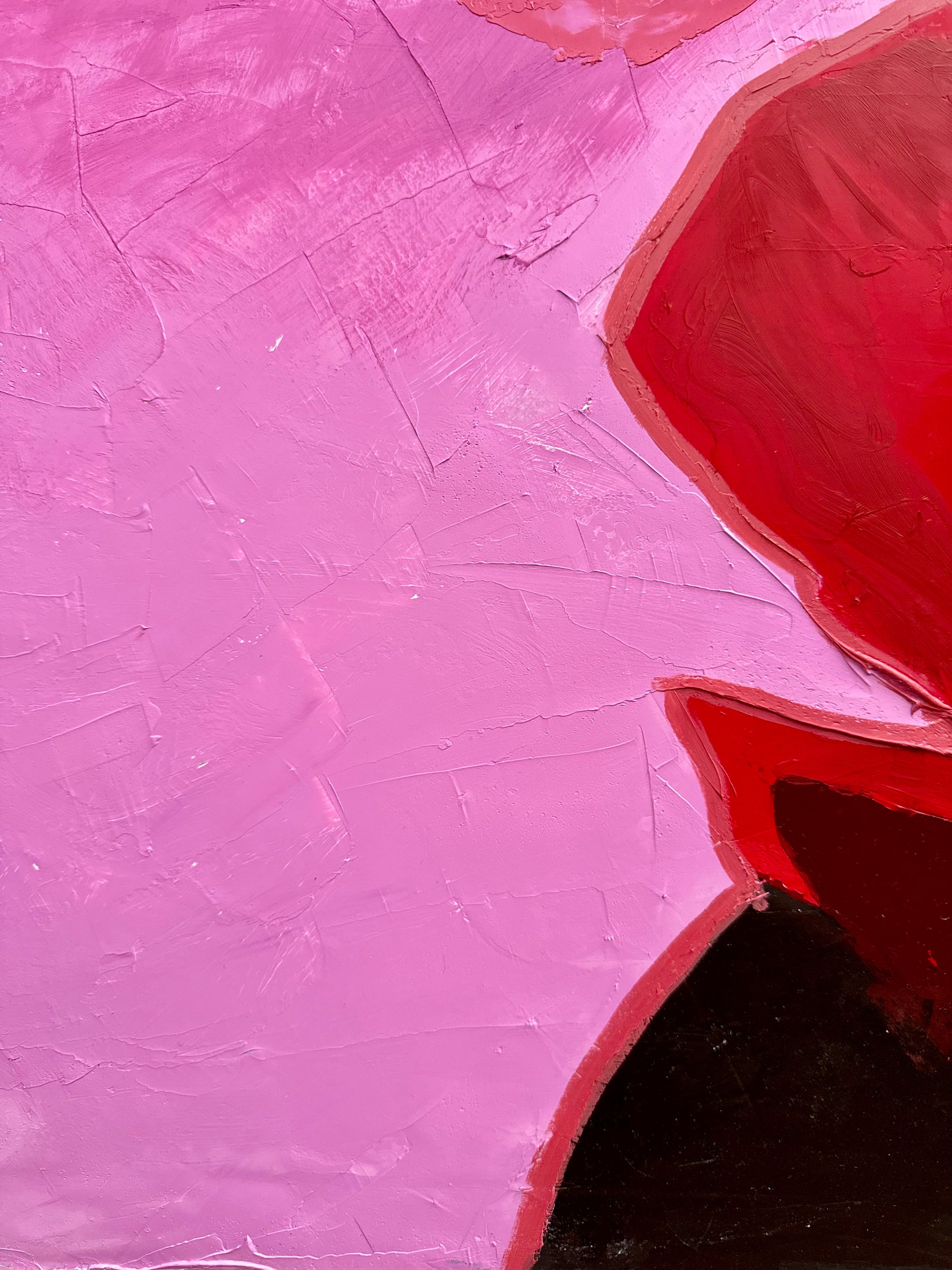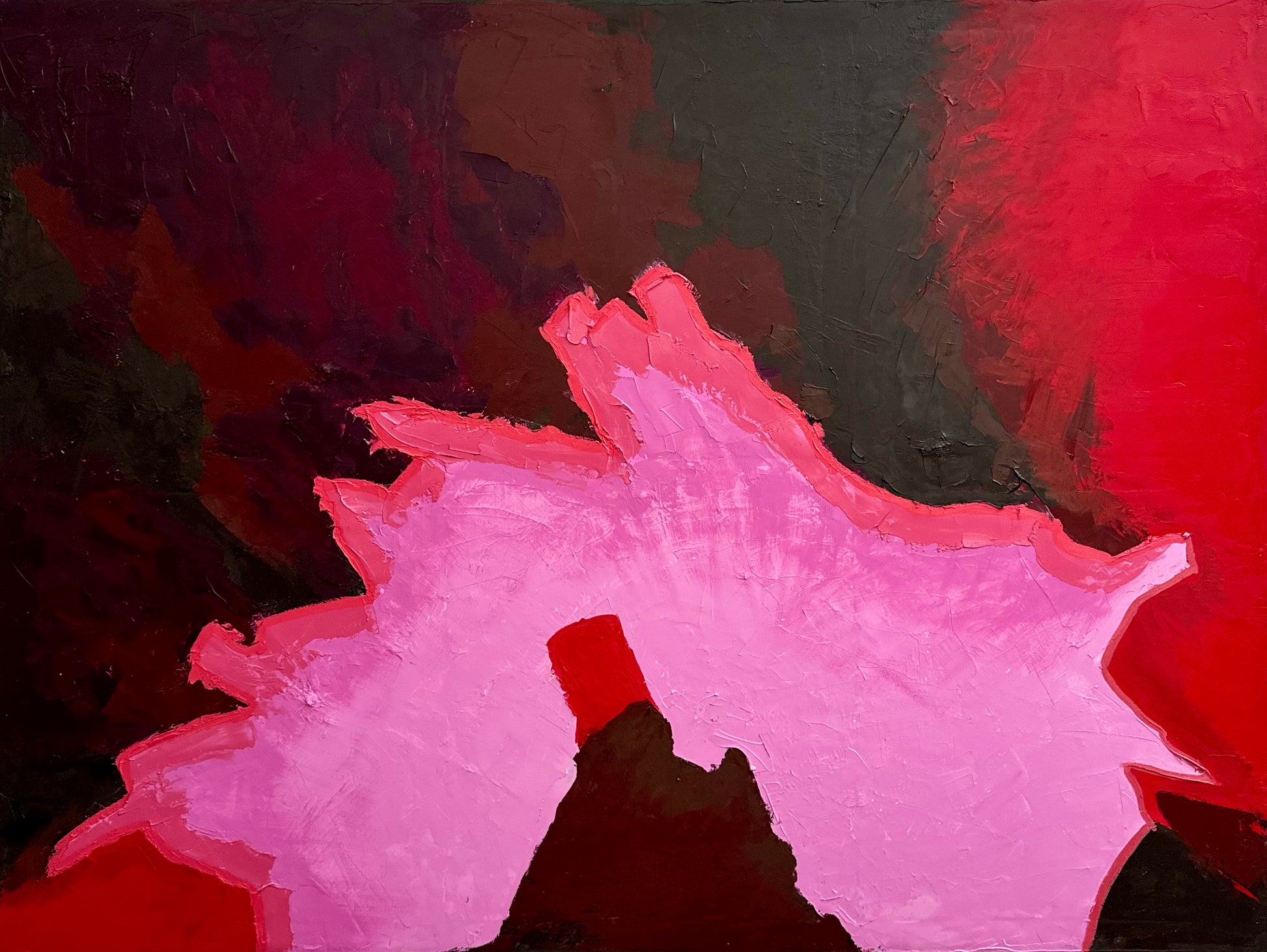 "Don’t let me be misunderstood” channels raw emotion through bold contrasts of crimson, black and vivid pink. The thick, impasto surface captures both tension and tenderness, evoking the fragility of being seen and the strength of self-expression. The work reflects on the complexity of communication: the desire to connect, yet the inevitability of misinterpretation.