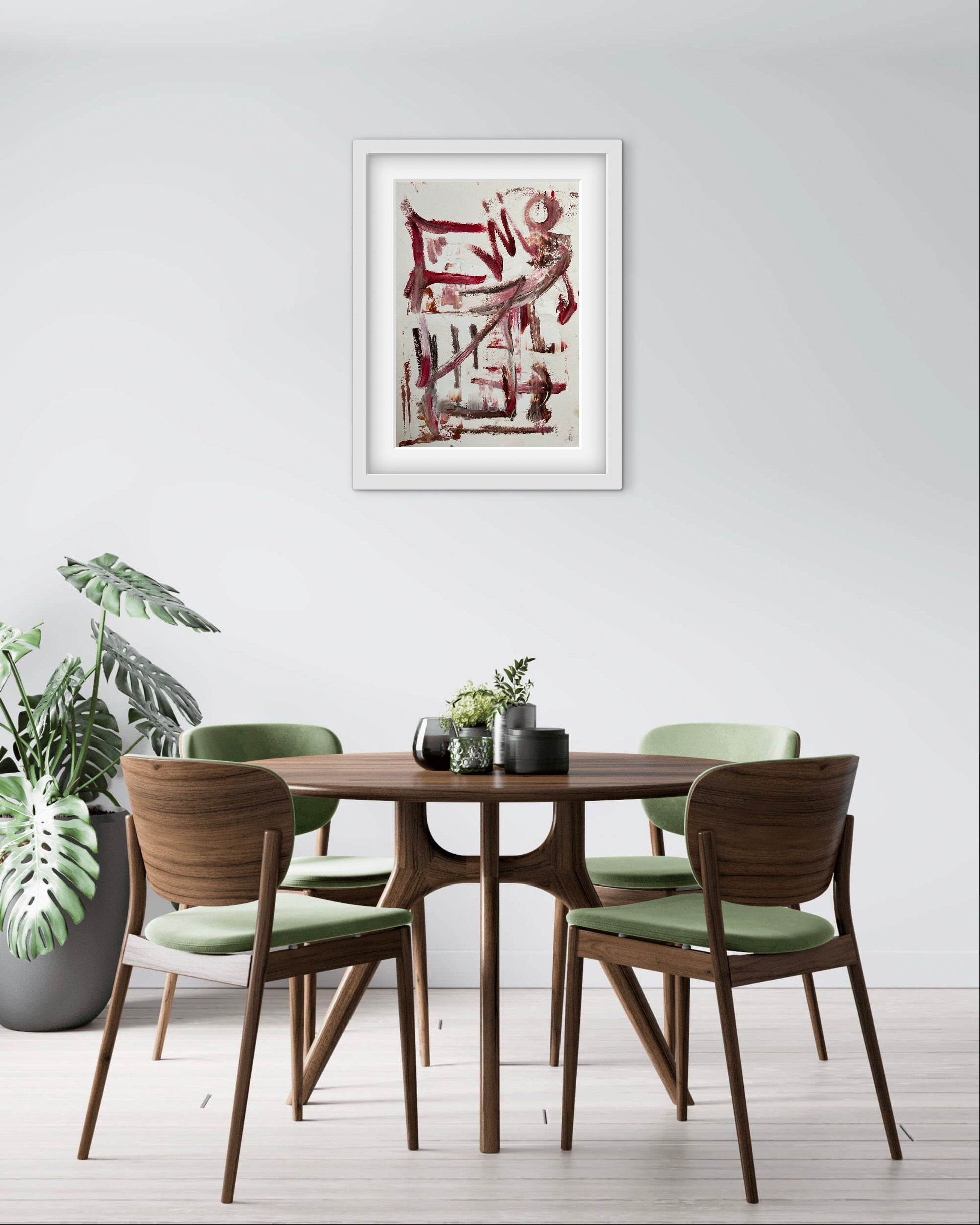 “Haunted House” is an exploration of memory, emotion, and the invisible structures we carry within. Through gestural strokes of crimson, sienna, and white, the painting evokes traces of presence, echoes of what once was. The layered marks feel both architectural and instinctive, suggesting walls built not of wood or stone, but of feeling and recollection.