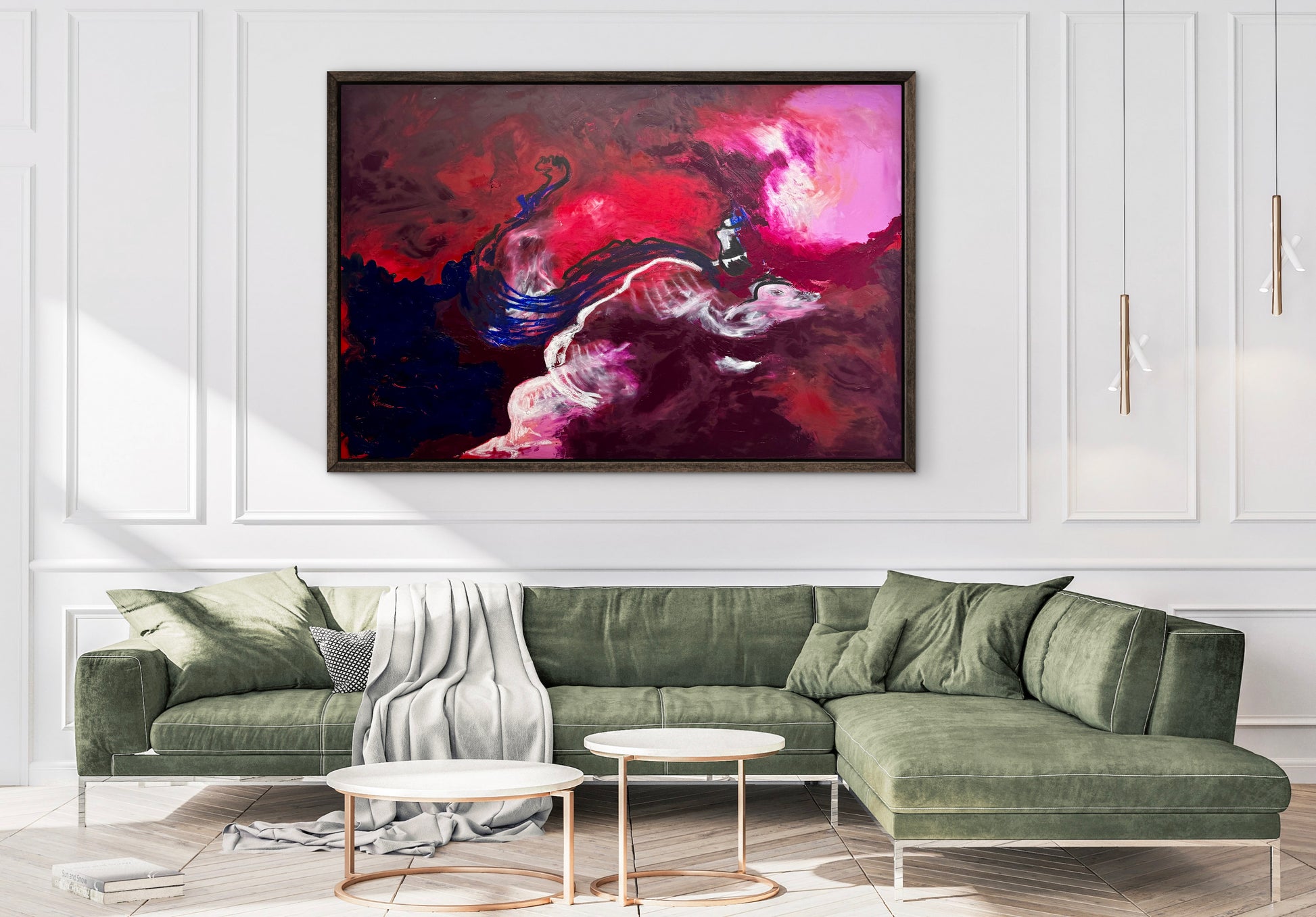 “In and out of love” traces the shifting currents of human connection, where passion collides with doubt and tenderness gives way to distance. Crimson flows fracture into luminous pinks and blues, suggesting both the fervour of desire and its inevitable fading. The work contemplates love as a cyclical force: luminous, turbulent, and never fixed, always caught between presence and disappearance.