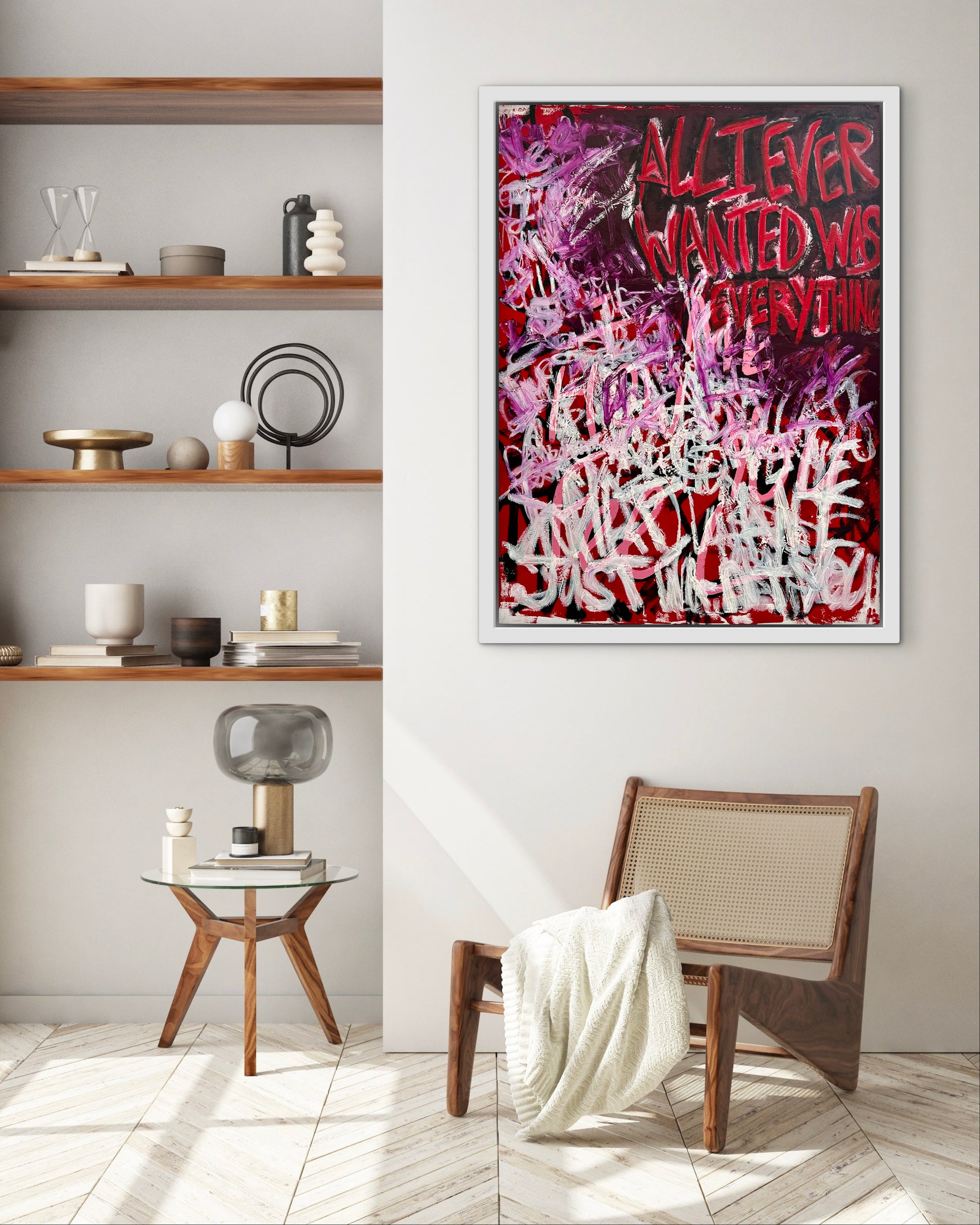 “Just can’t get enough” confronts the insatiability of modern culture: a landscape where ambition is endlessly fed yet never satisfied. The surging reds and layered strokes suggest desire stretched to excess, reflecting on how the pursuit of “everything” becomes both intoxicating and unsustainable. The work meditates on over-consumption, exposing the thin line between aspiration and appetite.