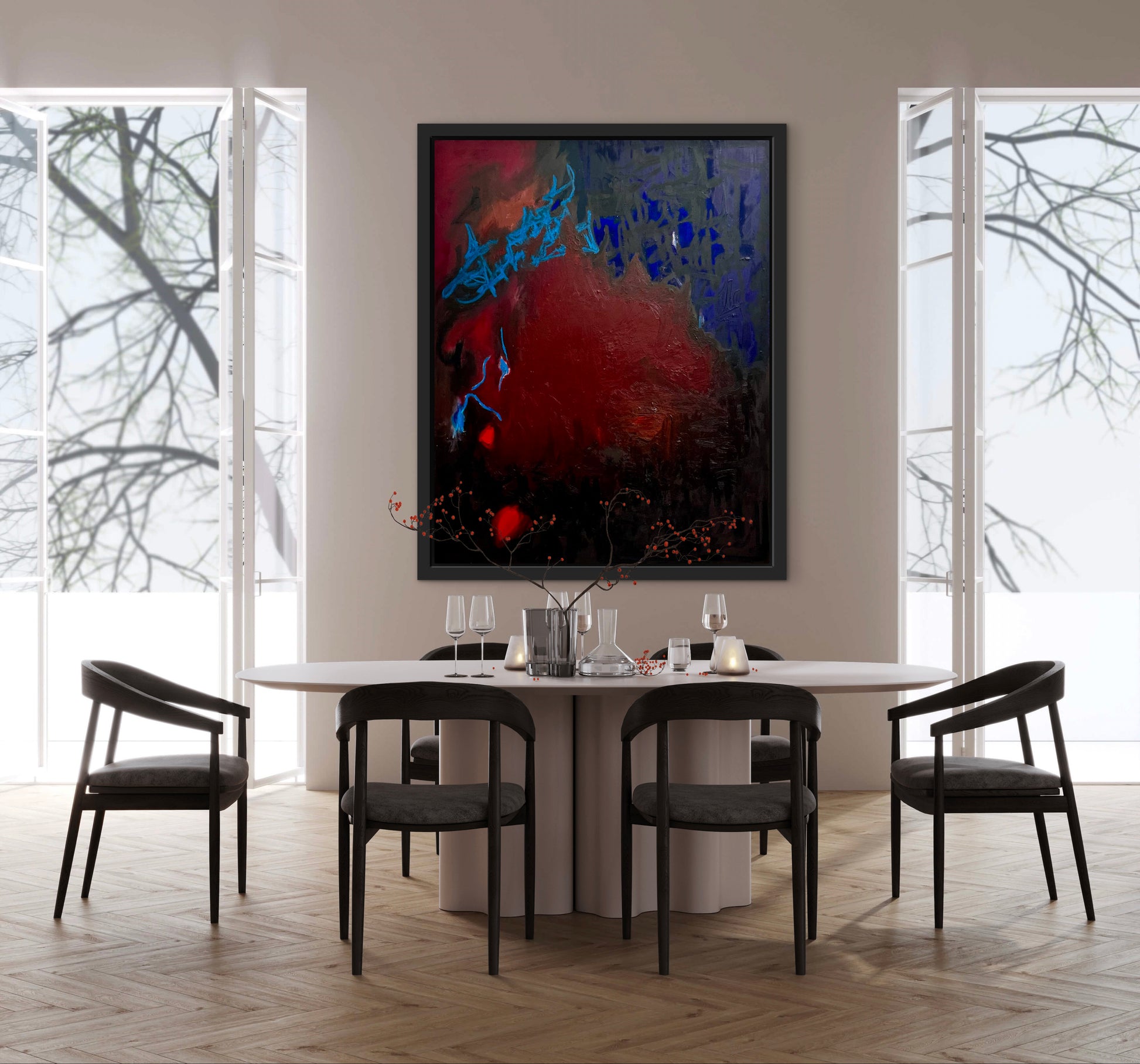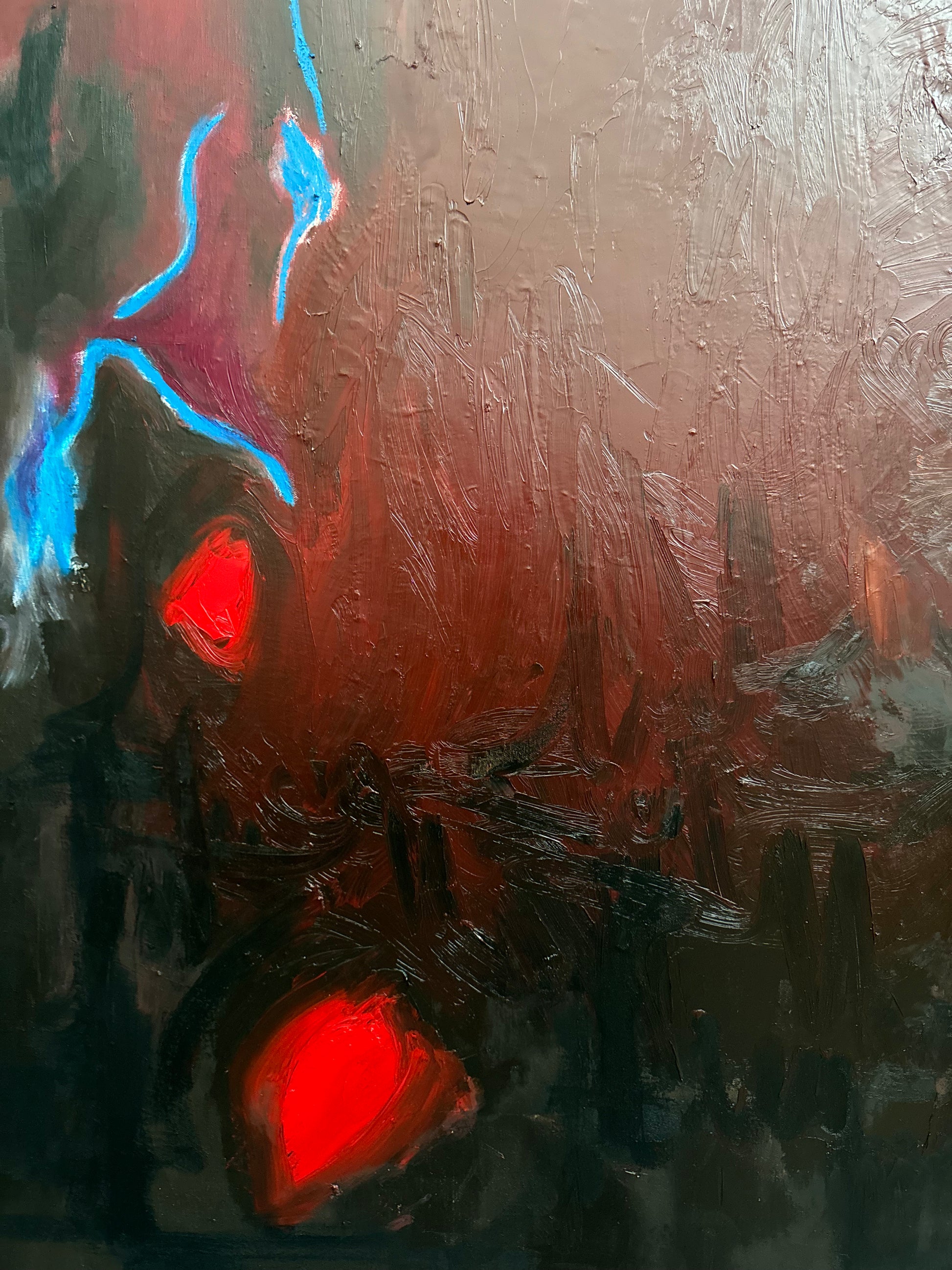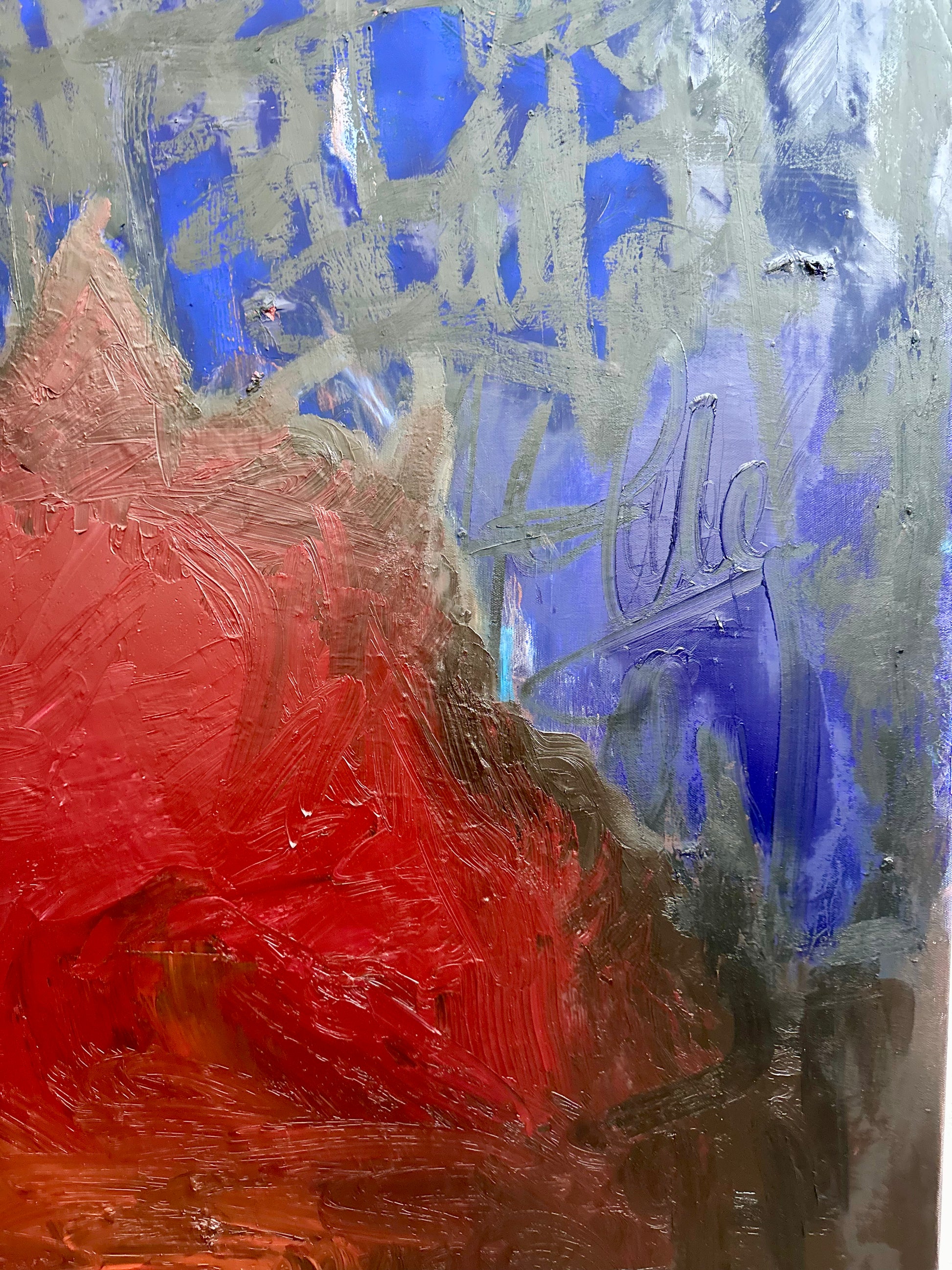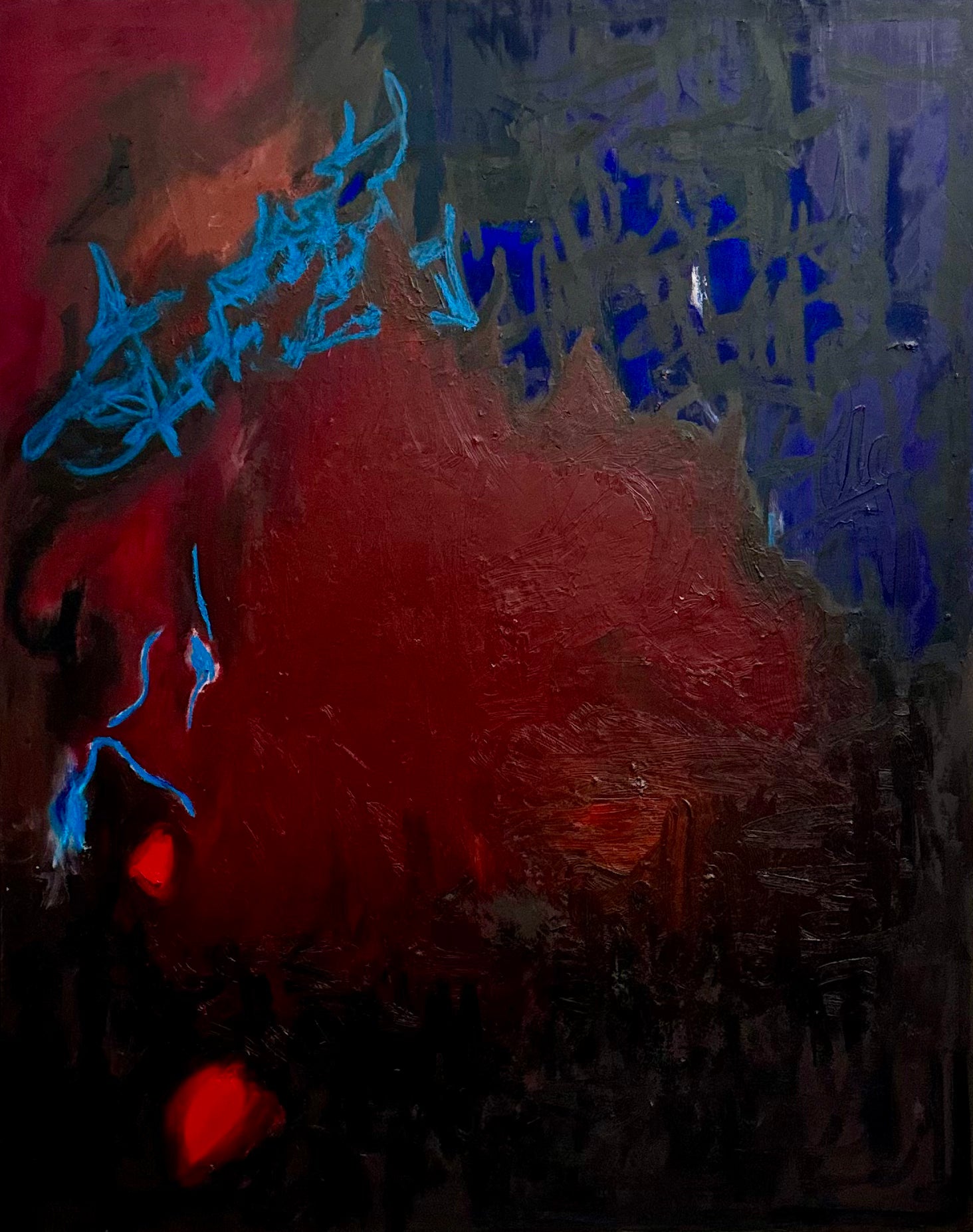 “Mind Off” is a dark immersive field of crimson and shadow, sets the stage for sharp, electric blue interventions that feel almost synaptic in their energy. The layered surface is rich, textured, and atmospheric, it suggests a movement away from conscious form into something more instinctive and intangible. Suspended between tension and release, the painting evokes a state where thought dissolves into pure sensation, offering a potent, contemplative presence within contemporary abstraction.