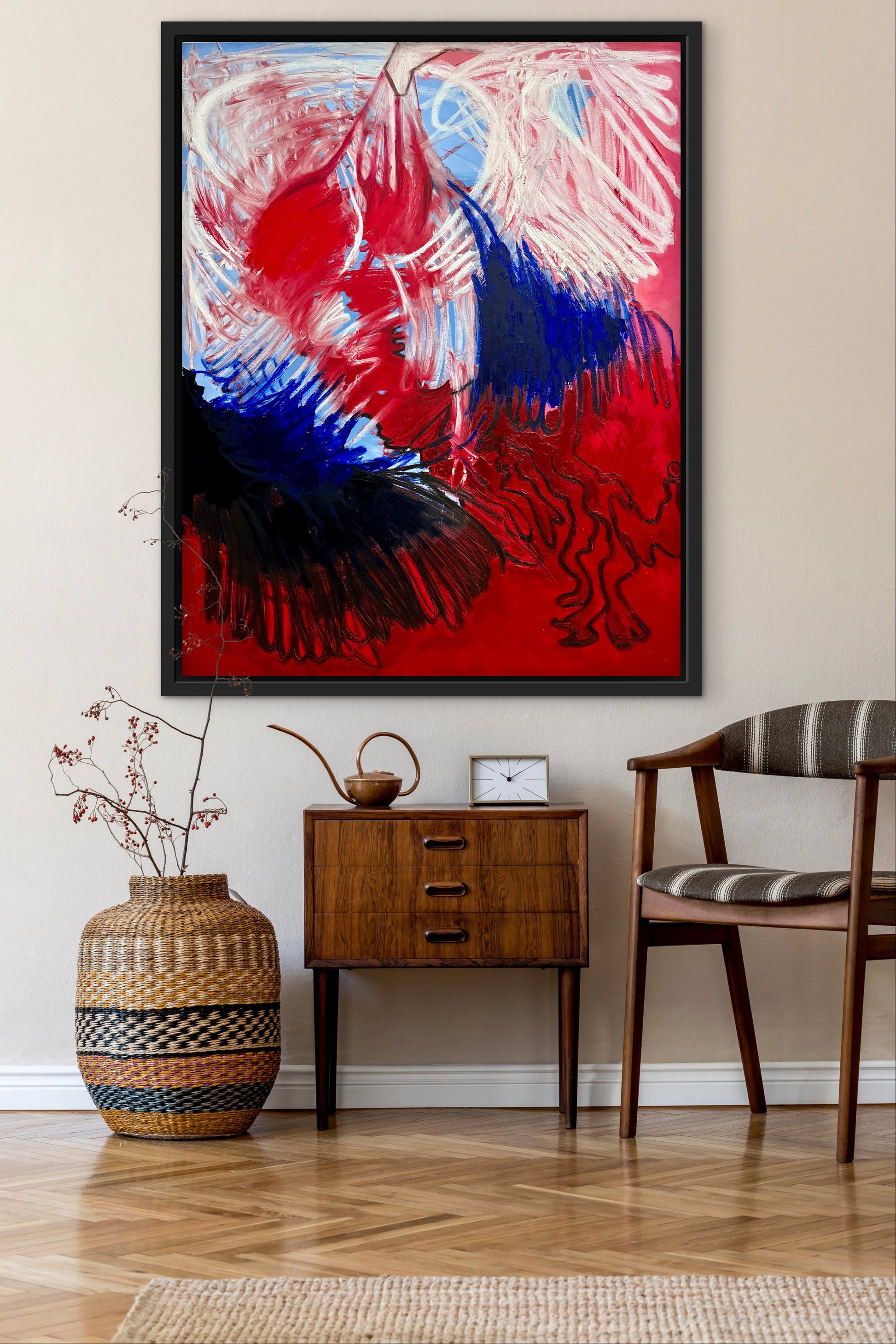 “Out of touch” unfolds in sweeping gestures of red, blue, and pale pink, capturing both urgency and distance. The energetic strokes evoke movement and disconnection, as if emotions surge forward yet remain just out of reach. The work reflects on the complexities of intimacy, the tension between closeness and estrangement, presence and absence.