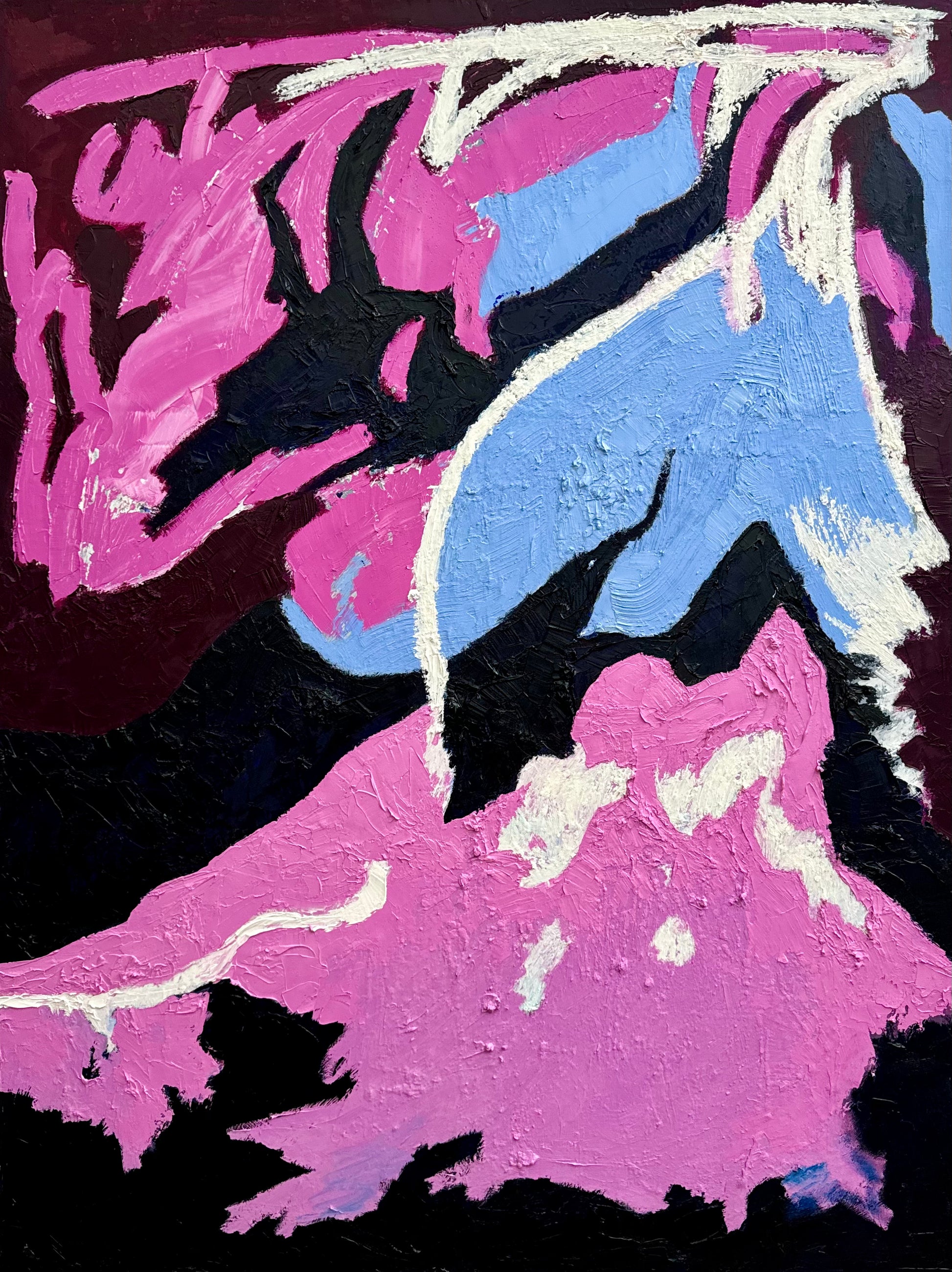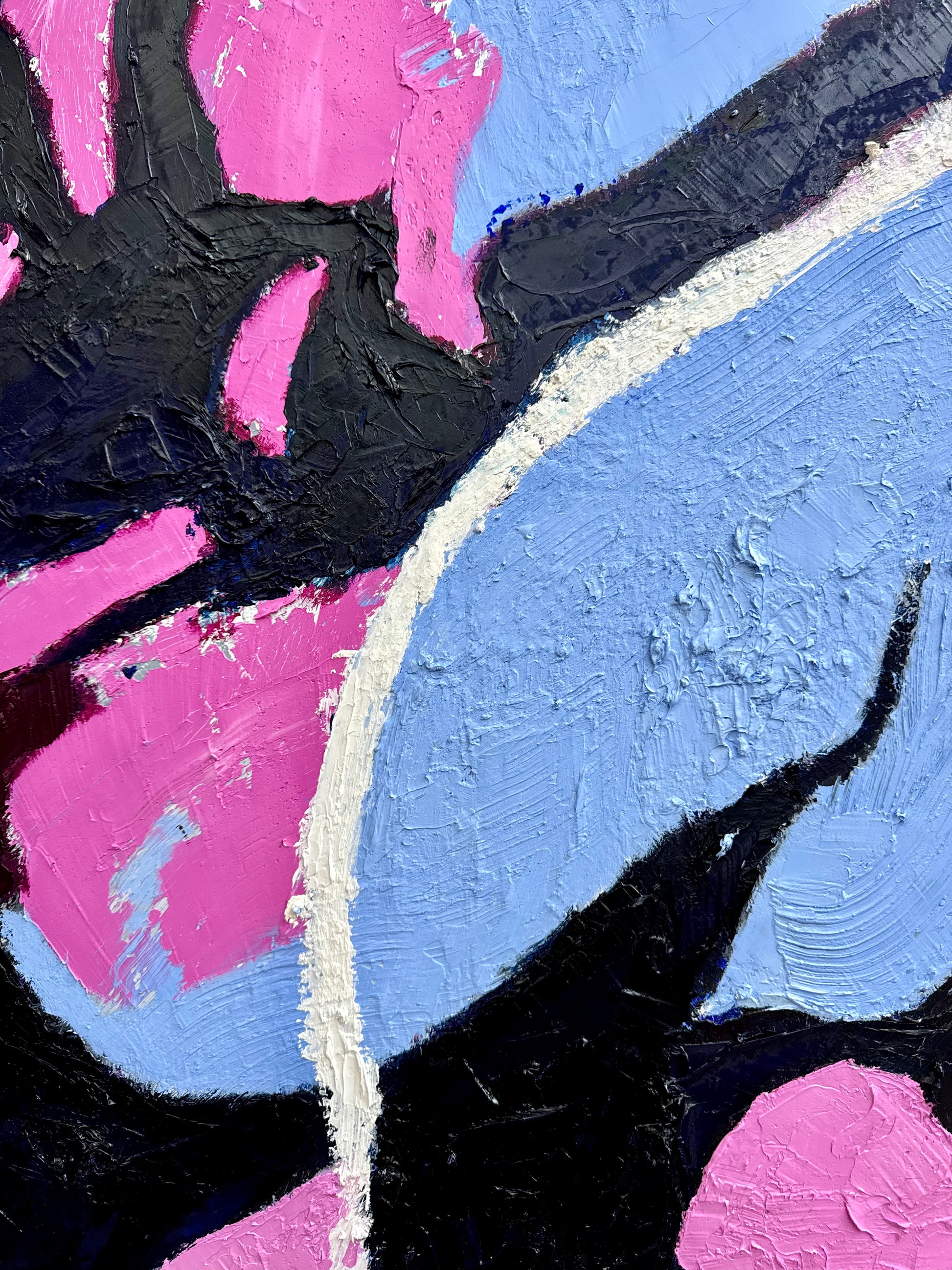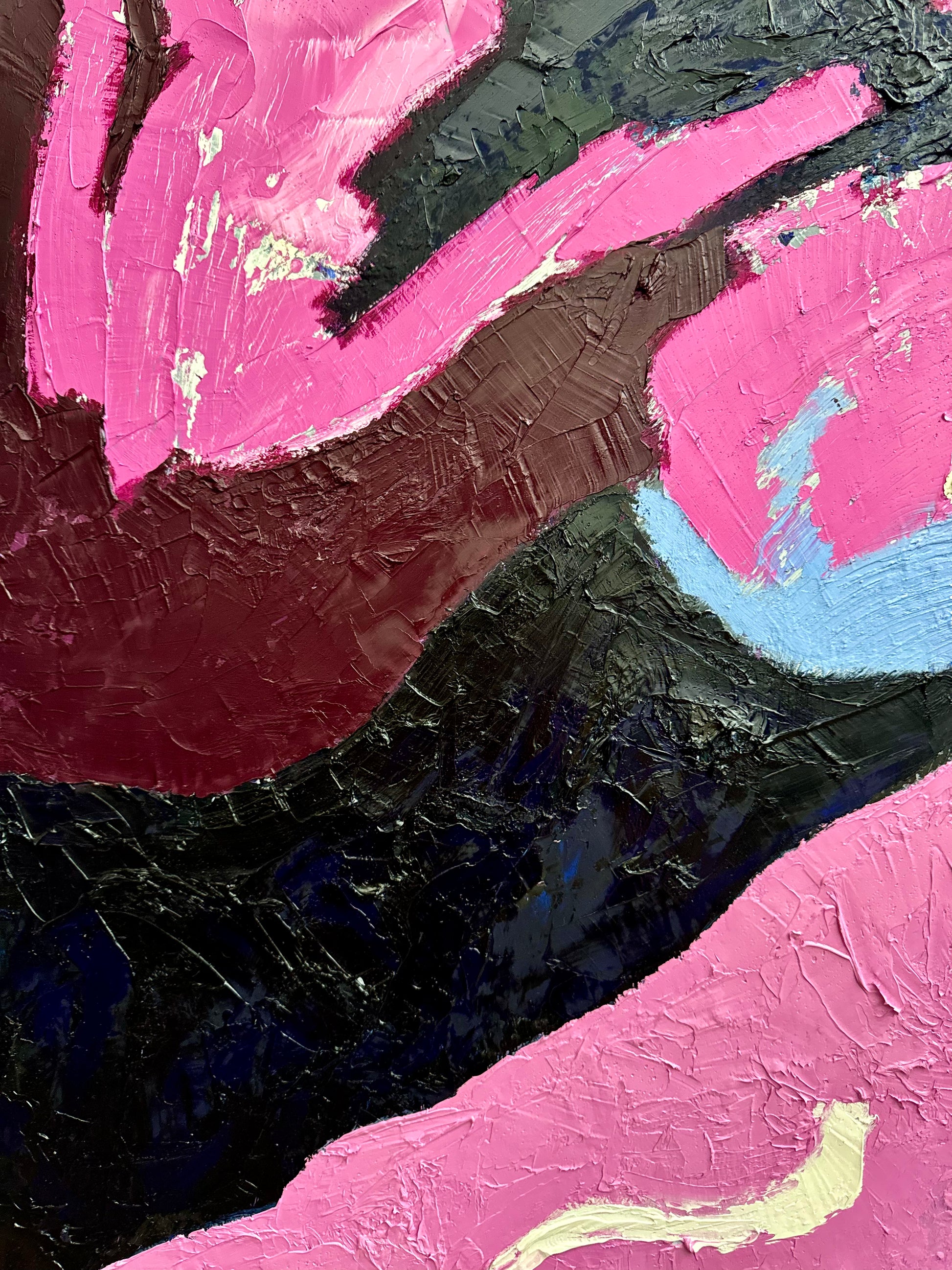 “Should I let myself go” captures the moment of hesitation between control and surrender. The sharp contrasts of pink, blue, and black embody both resistance and release, mirroring the tension within the human spirit when confronted with change. The work asks whether freedom lies in holding firm or in yielding, and suggests that the act of questioning itself is part of what makes us human.