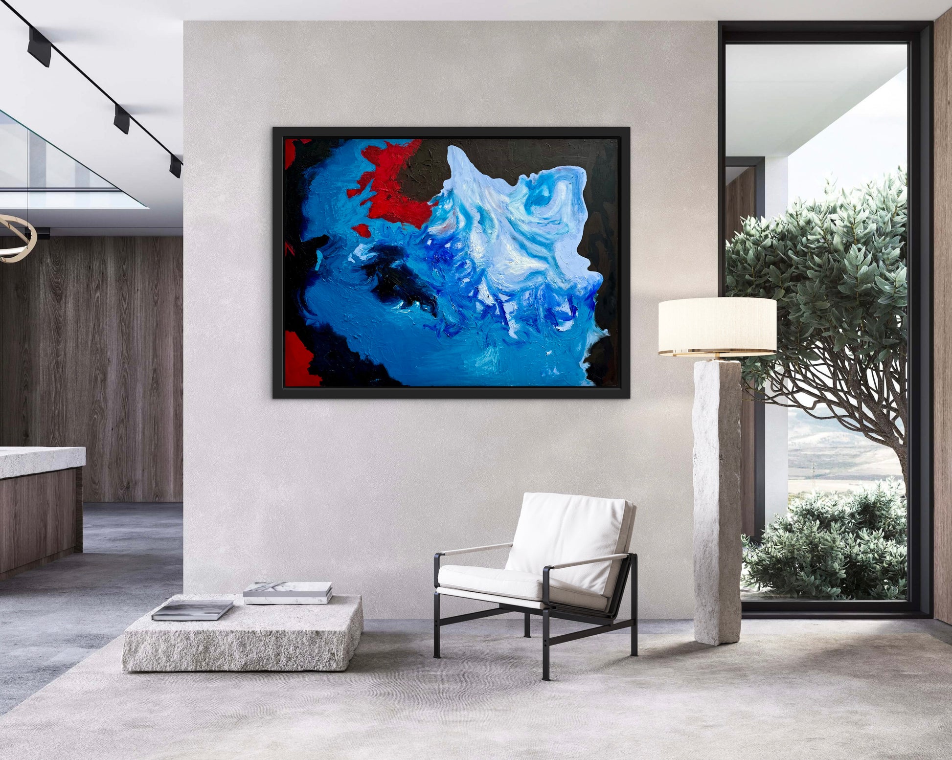“Spaces in between” explores the thresholds where presence gives way to absence, and form dissolves into movement. Shifting currents of blue, white, and red evoke the quiet intervals that often carry as much weight as action itself. The work reflects on how meaning is not only found in what is said or done, but in the pauses, silences, and transitions that shape human experience.