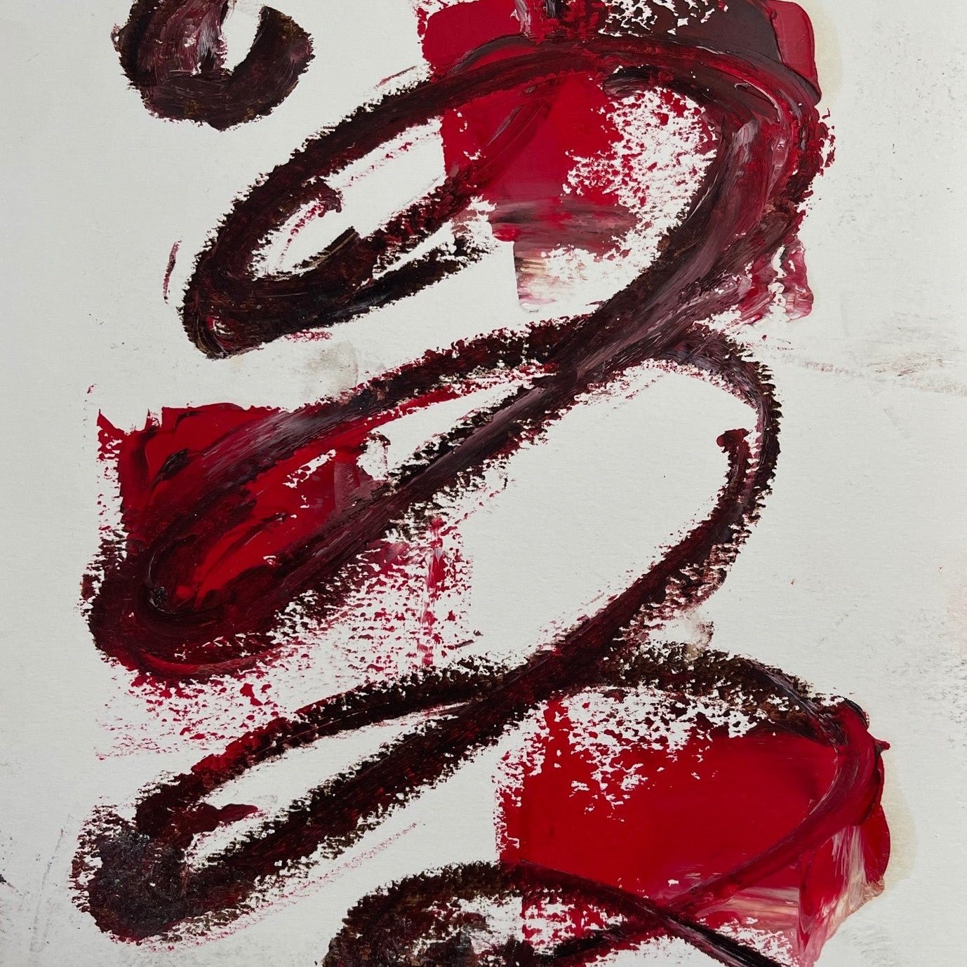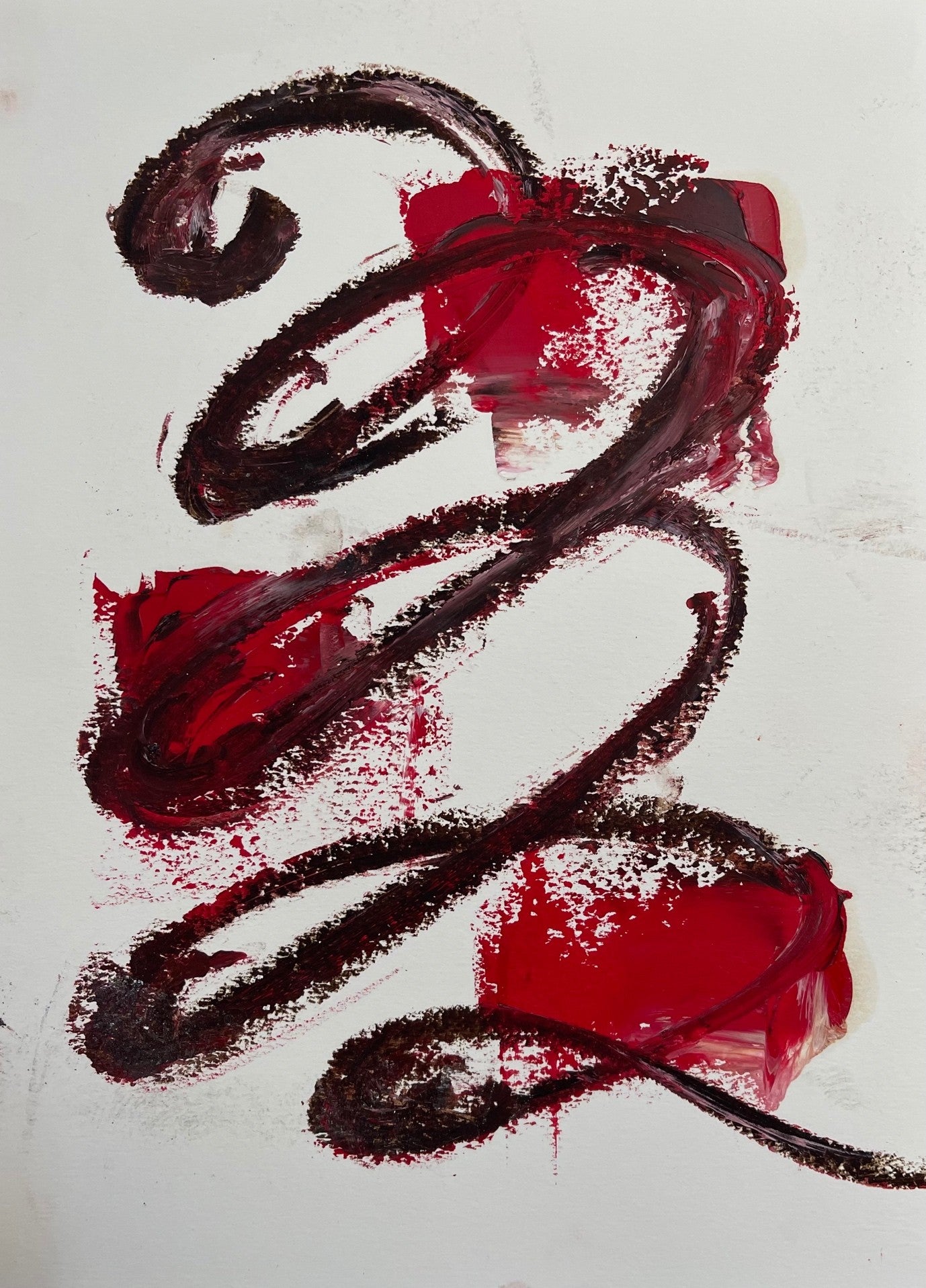 “Spinning Around” captures the rhythm of motion and emotion through sweeping gestures of crimson and umber. The composition spirals with raw energy, balancing chaos and control, a visual dance between passion and release. Layers of texture and movement invite the viewer into a state of momentum, where feeling becomes form.